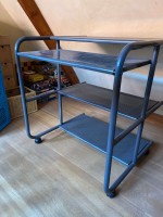 Verrijdbaar computertafetje van grijs geperforeerd metaal. wieltjes doen t nog goed. ooit gekocht bi ...