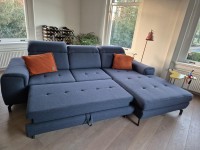 Comfortabele blauwe stoffen bank met verstelbare hoofdsteunen, lougegedeelte met opbergvak én de mo ...