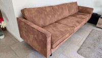 Een bruine kunstlederen driezits en grijze kunstlederen tweezits. twee zitplaatsen zijn iets doorgez ...