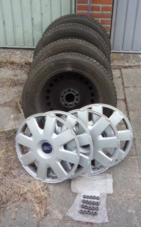 Set van vier Michelin winterbanden Tubeless 205/55 R16, eerder onder Ford Focus Wagon 1.6 TDCI. Met vier bijpassende Ford wieldoppen. Ca 6 mm profiel. Aantal jaren niet gebruikt.