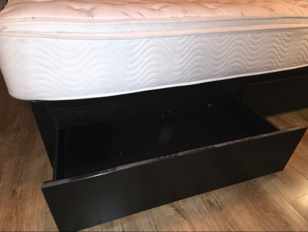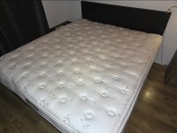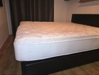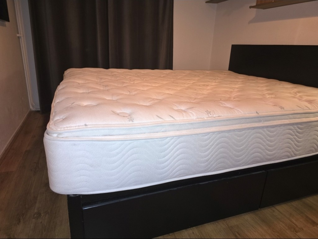 Ikea bed met goede lattenbodem die verstelbaar is. Daarop een ruim 10cm dikke pocketvering matras (california king)