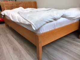 Houten bed met hoofdbord van houten latten. Lattenbodems inclusief.