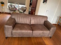 Bankstel (2,5 zits) met bruine stoffen bekleding is onbeschadigd en heeft memory foam als zitvulling. Afmetingen zijn B:206 cm, H: 90cm en D:95cm.