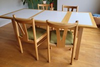 Gebruikte eethoek , massief beuken. Tafel met wit blad en kleine beschadiging. Afmeting 1.40 mtr. uitklapbaar tot 1.90 mtr.breed 90 cm hoog 72 cm. (inclusief afwerkbalk 10 cm) 4 massief beukenhouten stoelen met bekleedde zitting