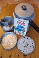 Prestige snelkookpan 4,5 l (ongeveer 3,8 l bruikbaar), inclusief originele ruimteverdelers & stoommandjes om ingrediënten apart te koken/stomen en receptenboek.