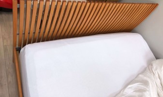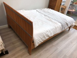 Houten bed met hoofdbord van houten latten. Lattenbodems inclusief.