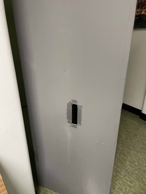 Metalen lockerkast met deuren die open kunnen. Wel gebutst en gedeukt! Oude staat. Een van de deuren sluit niet boven en onder. Zie foto’s.