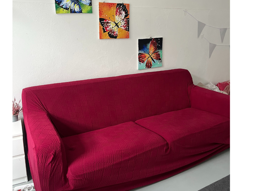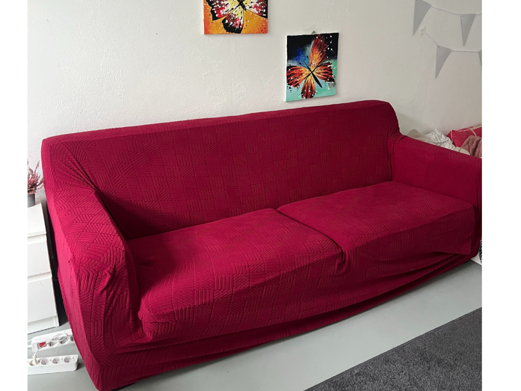 Comfortabel en ruim, met afneembare hoes in diepe rode kleur.