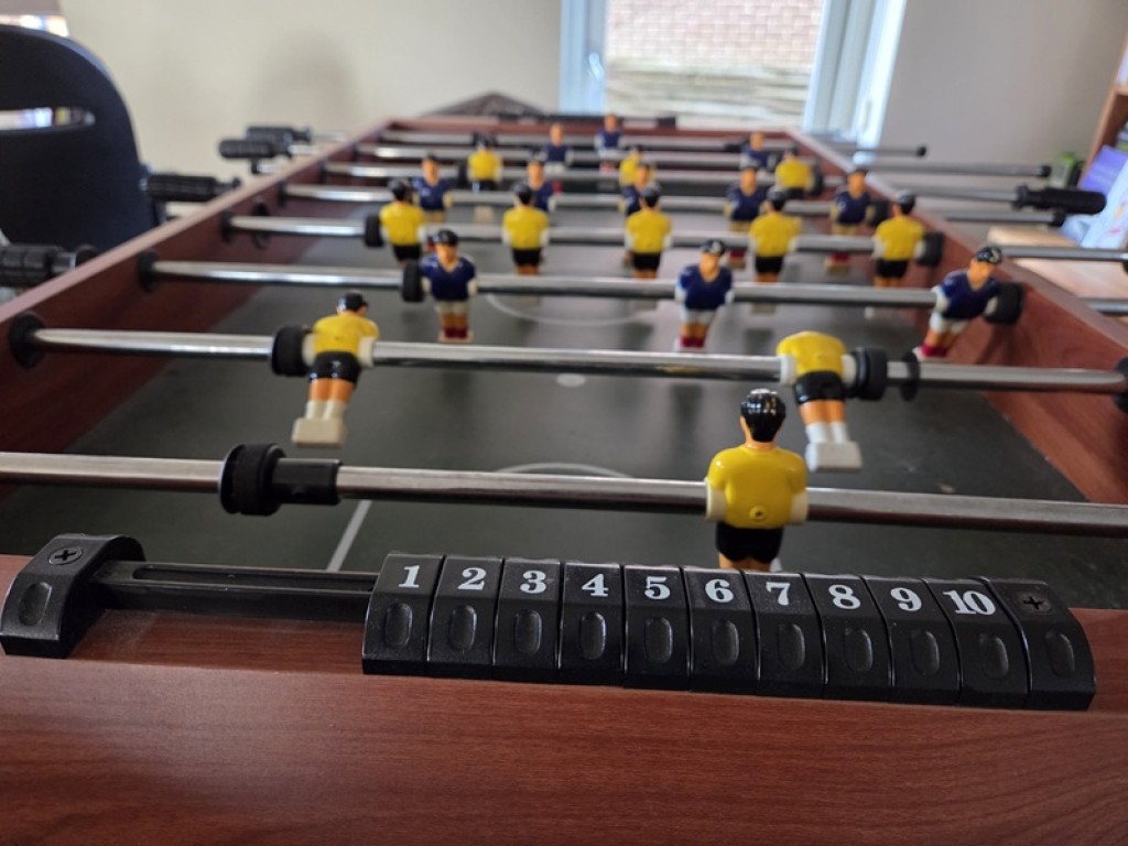 Voetbaltafel met houten bekisting. De spelers zijn van porselein (al mist 1 speler een hoofd...).